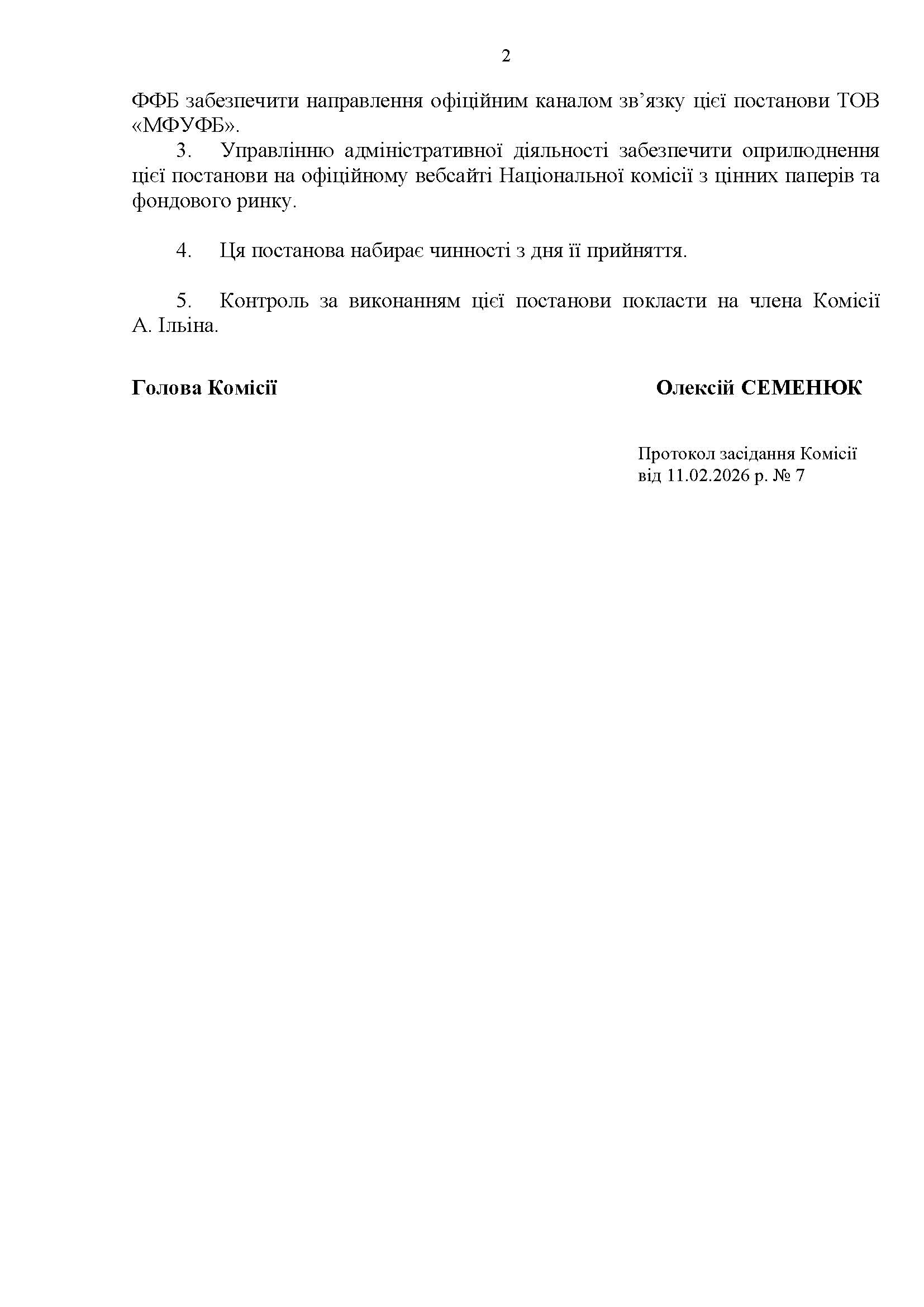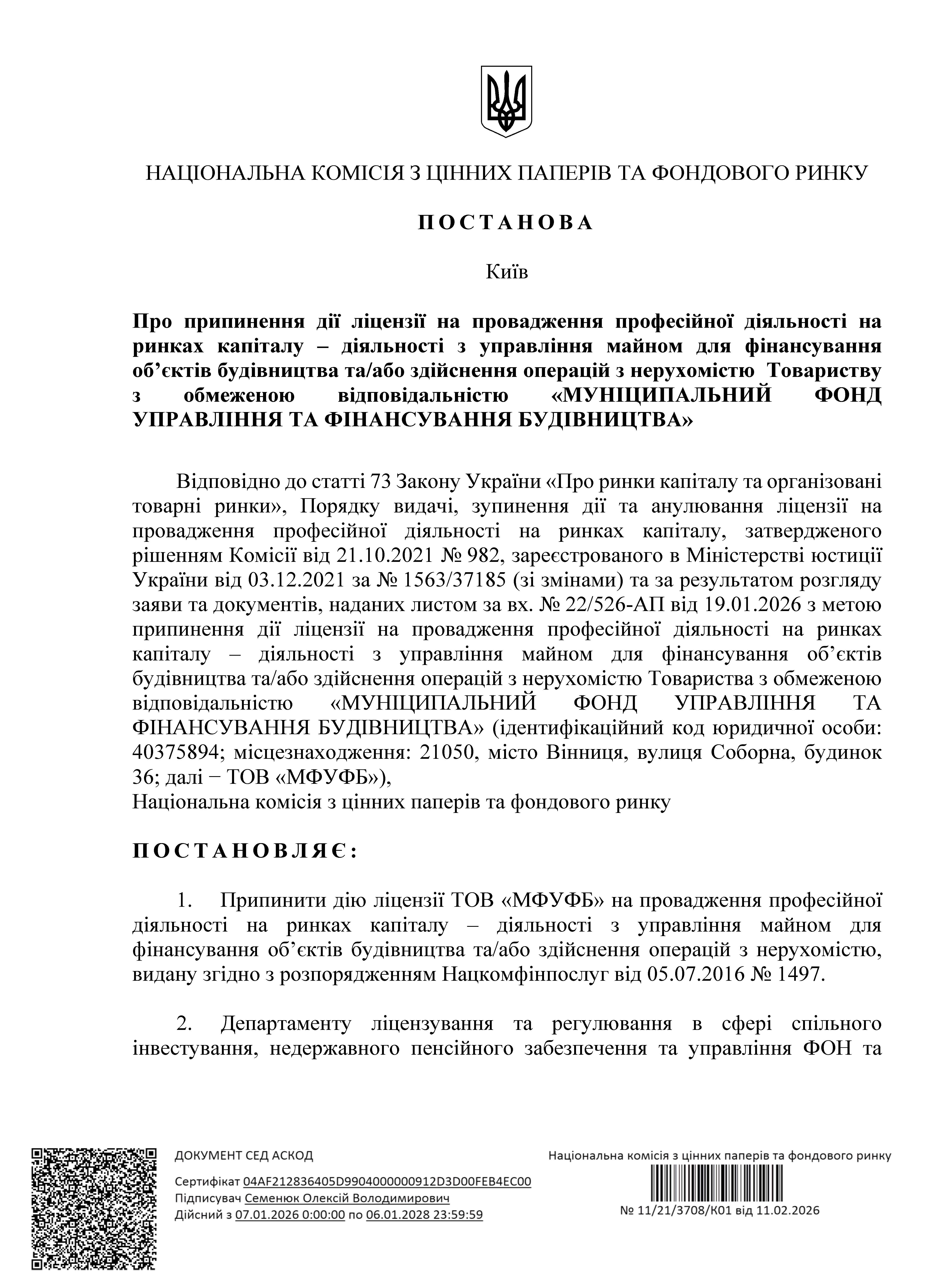 Товариство з обмеженою відповідальністю «Муніципальний фонд управління та фінансування будівництва» (ідентифікаційний код юридичної особи: 40375894; місцезнаходження: 21050, Вінницька обл., Вінницький р-н, м. Вінниця, вул. Соборна, буд. 36; далі − ТОВ «МФУФБ»), повідомляє, що відповідно до рішення Національної комісії з цінних паперів та фондового ринку № 11/21/3708/К01 від 11.02.2026, було припинено дію ліцензії ТОВ «МФУФБ» на провадження професійної діяльності на ринках капіталу – діяльності з управління майном для фінансування об’єктів будівництва та/або здійснення операцій з нерухомістю, видану згідно з розпорядженням Нацкомфінпослуг від 05.07.2016 № 1497. Дію ліцензії припинено на підставі заяви Товариства, поданої до НКЦПФР.